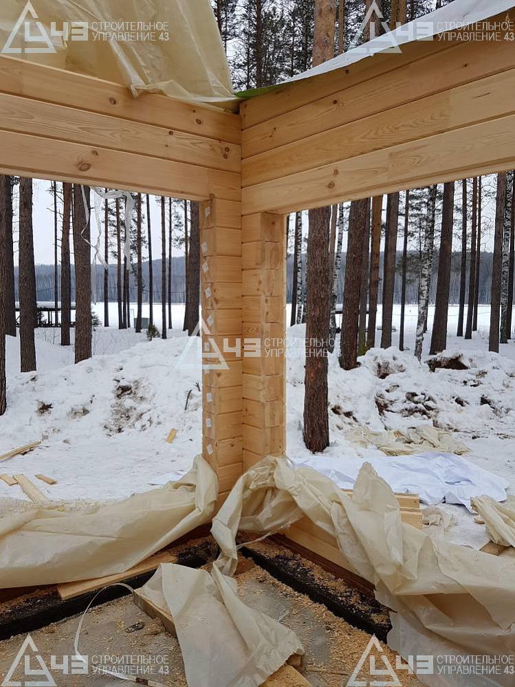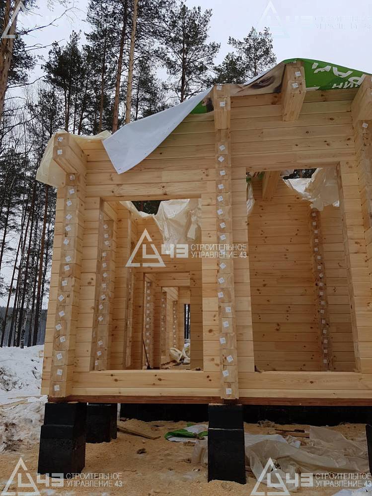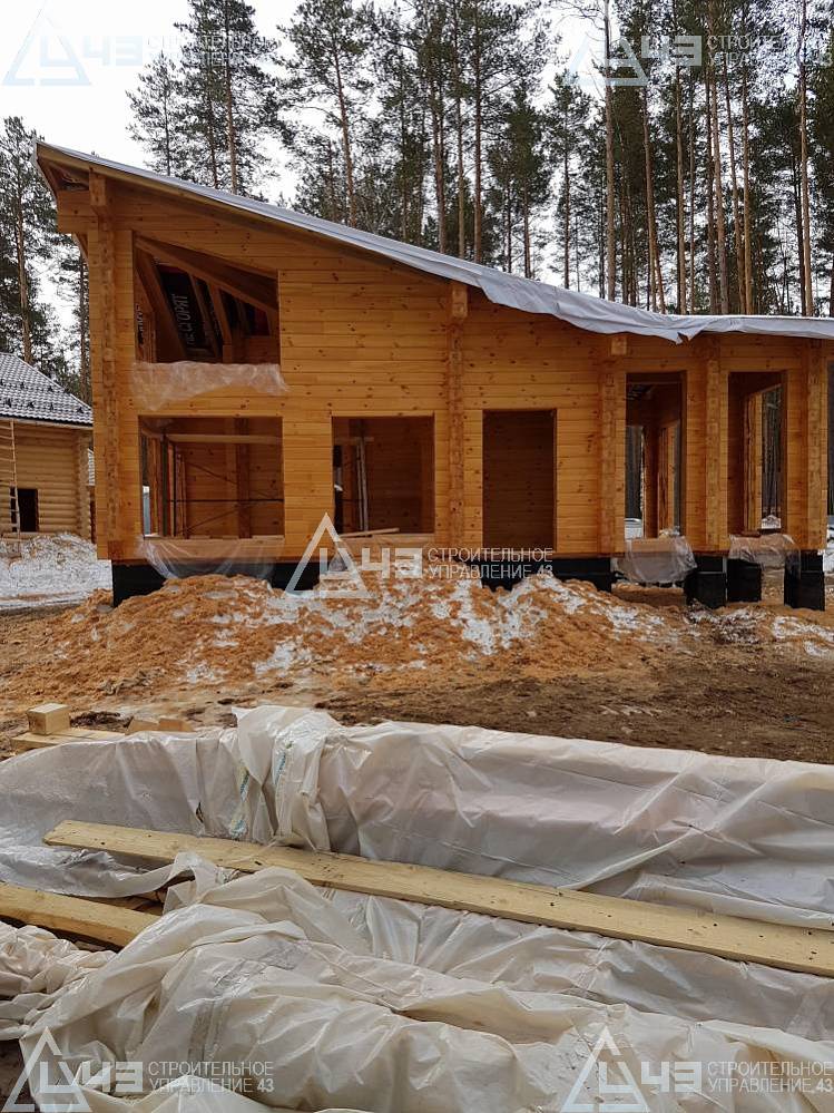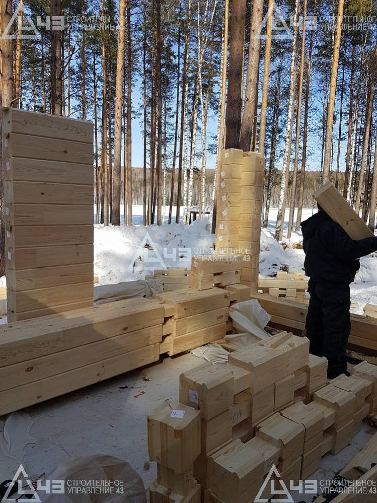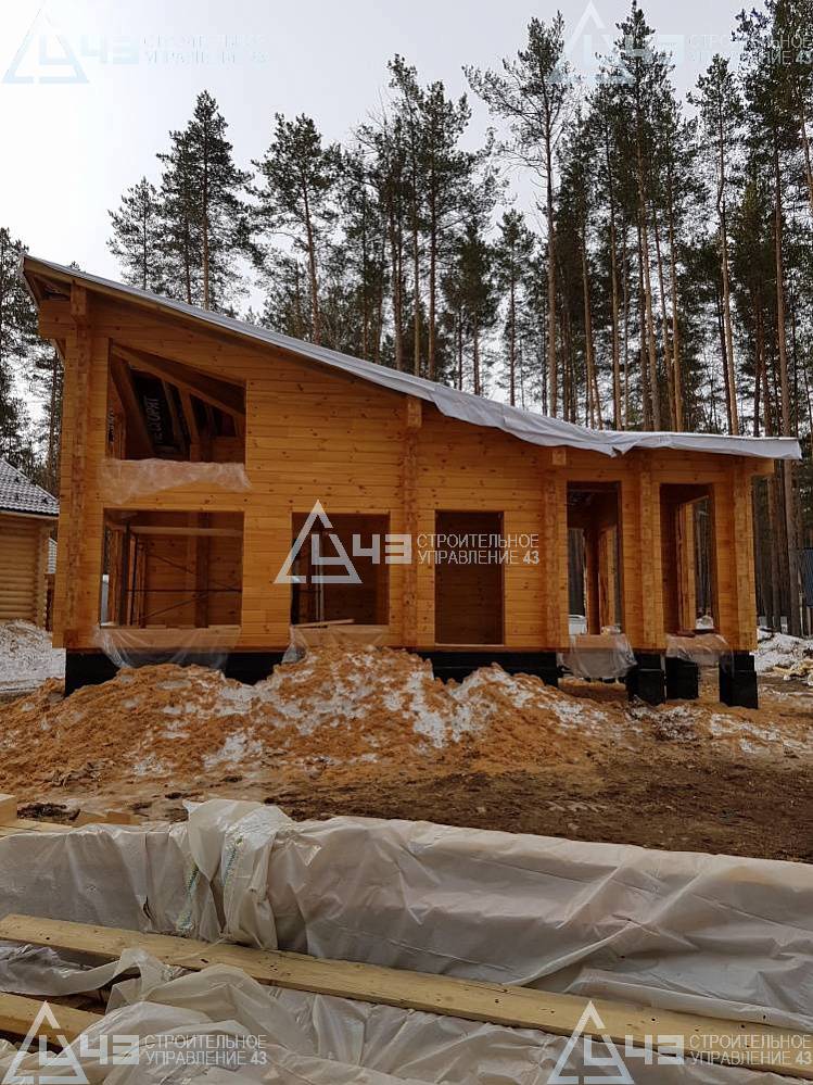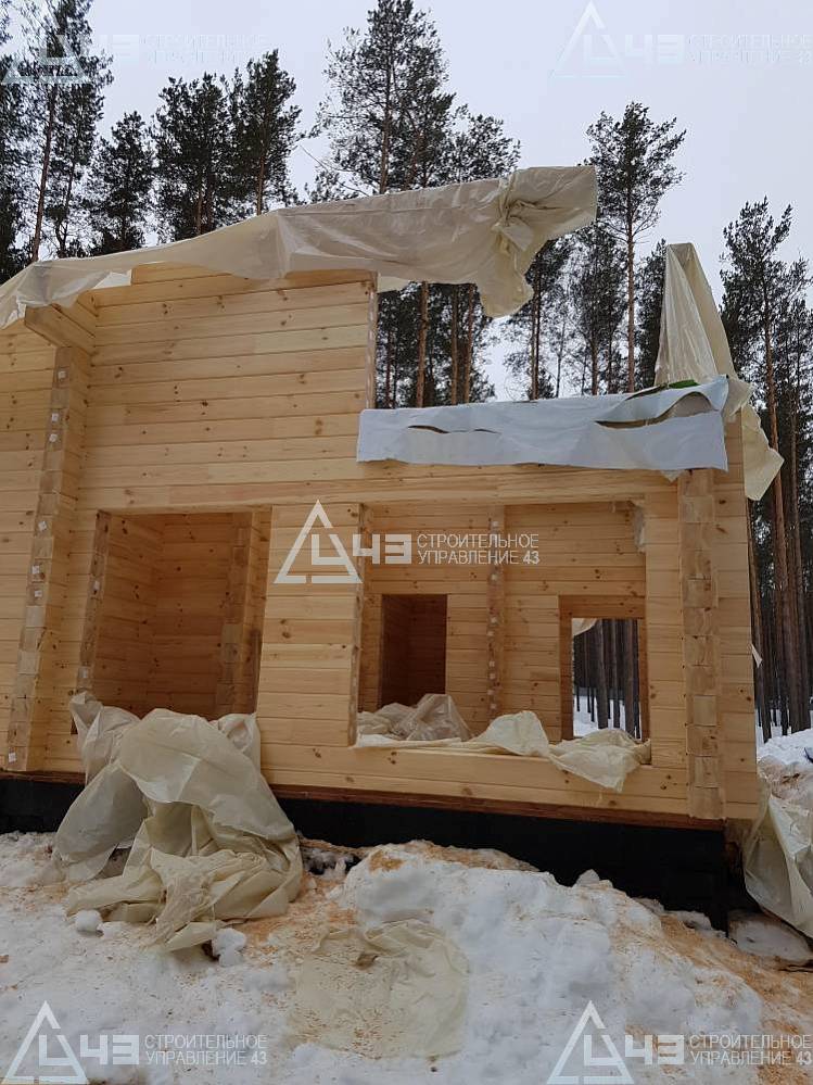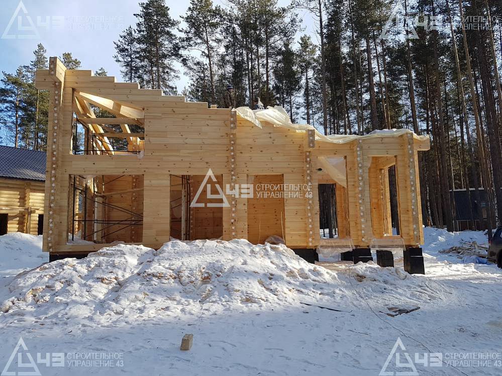 The house construction in Tchaikovsky, using the 185*200 mm glued beam. The total area is 40.48 m3. The volume of the glued beam is 44.82 m3. The idea of the house project was decided by the customer. Below you can see pictures of the house project and the construction process.